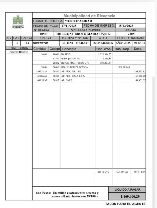 La directora Legal y Tributaria, Daniela Hillcoat, decidió cortar de raíz la operación: publicó su recibo de sueldo completo, donde consta que percibe $1.469.600,00, muy lejos de los $6.366.737 que Rivadavia Primero aseguró sin ningún sustento.