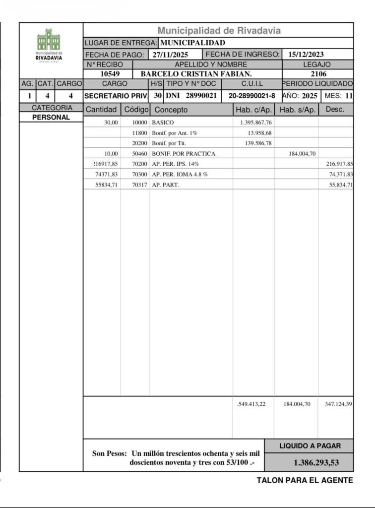 En la misma línea, el secretario privado Cristian Barceló también hizo pública su liquidación salarial. El documento oficial detalla que su sueldo es de $1.386.293,53, cifra que derrumba la versión difundida por la oposición, que hablaba de $3.183.368,50.