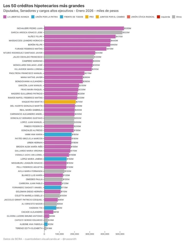 En los últimos días, una investigación basada en datos públicos de la plataforma “¿Cuánto Deben?” reveló que una serie de funcionarios y legisladores vinculados a La Libertad Avanza (LLA) accedieron a créditos hipotecarios millonarios otorgados por el Banco Nación. La polémica escaló rápidamente al conocerse que las deudas registradas por algunos diputados, como Alejandro Bongiovanni, Mariano Campero y Lorena Villaverde, oscilan entre los $230 millones y $279 millones.