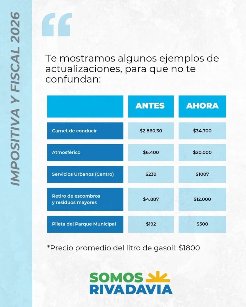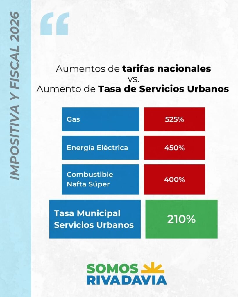 El bloque de Somos Rivadavia, actualmente oficialista, presentó el Presupuesto y la Ordenanza Fiscal e Impositiva 2026, luego de que durante 2025 no se lograra actualizar el esquema tributario municipal debido a que el bloque opositor Rivadavia Primero no aprobó el presupuesto correspondiente. Desde el Ejecutivo señalaron que esta situación generó un déficit cercano a los 600 millones de pesos, afectando la capacidad de inversión y la prestación de servicios en el distrito.