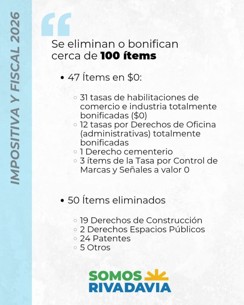 Según lo informado, el proyecto contempla la eliminación y bonificación total de cerca de 100 ítems. En detalle, 47 tasas pasarán a tener valor cero, entre ellas habilitaciones comerciales e industriales, derechos administrativos, un derecho de cementerio y conceptos vinculados al control de marcas y señales. Además, se eliminan otros 50 ítems, incluyendo derechos de construcción, espacios públicos y diversas patentes.